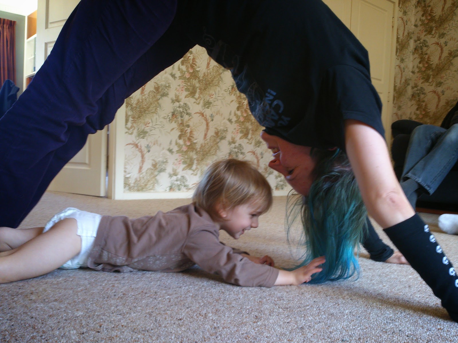Auntie Angela and Sebastian were doing some yoga poses. Sebastian showed her how he can do downward dog. But then he got distracted by her hair.